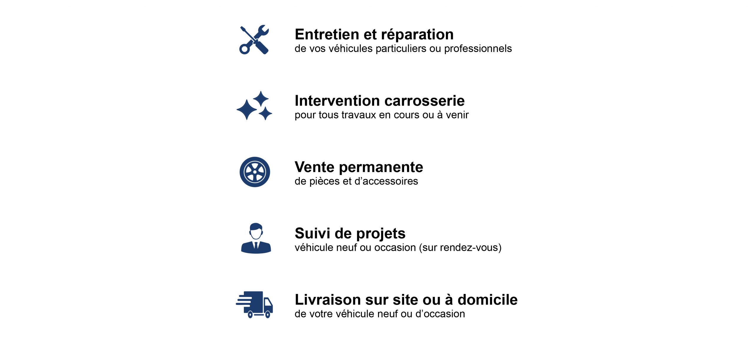 l’entretien et la réparation, les interventions carrosserie, la vente de pièces et d’accessoires, le suivi de projet d’achat ou encore la livraison de votre véhicule neuf ou d’occasion.