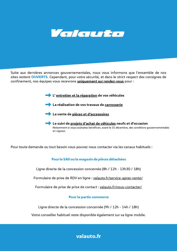 #infoCovid Publié le 30 octobre 2020 Partager sur : A découvrir également Contrôle technique OFFERT Audi CONTRÔLE TECHNIQUE OFFERT JUSQU’AU 9 DECEMBRE 2024 Jusqu’au 9 décembre 2024, Audi Valenciennes réalise le… Lire l'article Contrat d’entretien Seat MENSUALISEZ VOS DEPENSES. 12€/mois* pour les véhicules électriques 26€/mois* pour les véhicules thermiques et hybrides… Lire l'article Contrat d’entretien Volkswagen MENSUALISEZ VOS DEPENSES. 12€/mois* pour les véhicules électriques 26€/mois* pour les véhicules thermiques et électriques… Lire l'article