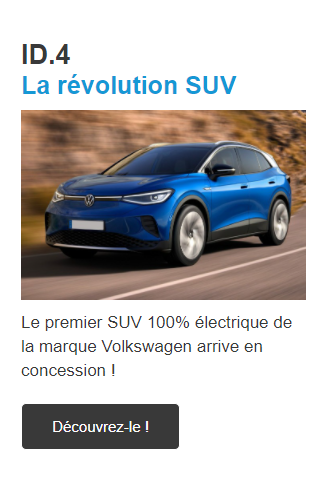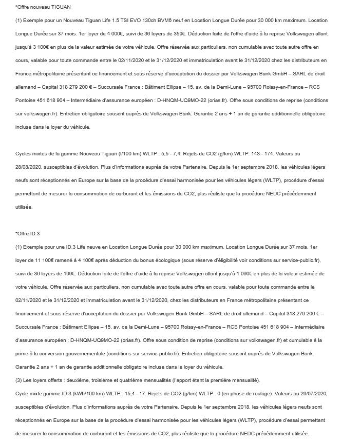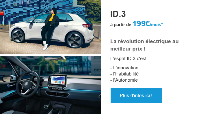Entretien VIP inclus (2) Véhicule de Remplacement Tous Risques inclus (3) (2) Entretien VIP : coût mensuel inclus dans les loyers : 7,00 €. Contrat souscrit auprès de Vokswagen Bank GmbH – SARL de droit allemand Capital 318 279 200 € Succursale France : Bâtiment Ellipse, 15 Avenue de la Demi-Lune, 95700 Roissy en France – RCS Pontoise 451 618 904 – Mandataires d’assurance et d’intermédiaire d’assurance – ORIAS : N°08 040 267 (3) Véhicule de Remplacement Tous Risques : coût mensuel inclus dans les loyers : 7,00 €. Prestation souscrite auprès EUROP ASSISTANCE France, S.A. au capital de 23 601 857€. Siège social : 1, promenade de la Bonnette, 92230 Gennevilliers. RCS Nanterre n° 451 366 405 régie par le code des assurances.