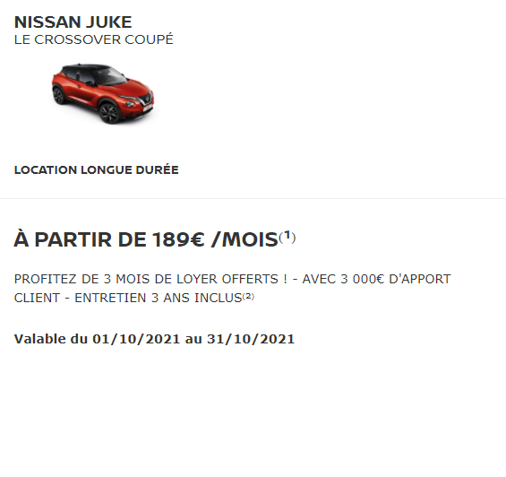 (1) Pour un Nissan JUKE DIG-T 114 VISIA neuf en Location Longue Durée sur 49 mois, 40 000 km maximum, 3 loyers offerts après paiement du 1er loyer majoré (apport) de 3 000€, puis 45 loyers de 189€. Restitution du véhicule chez votre Concessionnaire en fin de contrat avec paiement des frais de remise en état standard et des kilomètres supplémentaires. Sous réserve d’acceptation par Diac – 14 av. du Pavé Neuf 93168 Noisy le Grand. (2) Comprenant les prestations d’entretien (hors pièces d’usure et pneumatiques) selon conditions contractuelles. Modèle présenté : Nissan JUKE DIG-T 114 N-DESIGN neuf avec options peinture métallisée spéciale Rouge Fuji et jantes alliage 19 » Akari, 3 loyers offerts après paiement du 1er loyer majoré (apport) de 3 000€, puis 45 loyers de 298€. Offre réservée aux particuliers, non cumulable avec d’autres offres, valable jusqu’au 31/10/2021, dans la limite des stocks disponibles, chez les Concessionnaires NISSAN participants. NISSAN WEST EUROPE SAS : nissan.fr Consommations gamme cycle combiné (WLTP l/100km) : 5,9 – 6,3. Émissions CO2 (WLTP g/km) : 134 – 144.