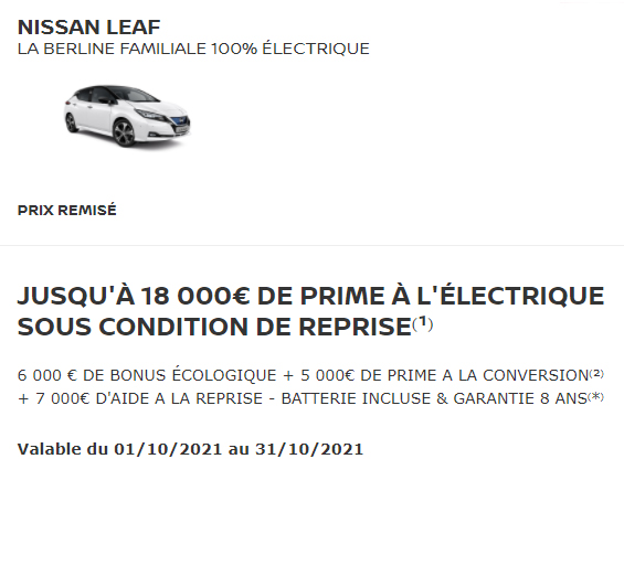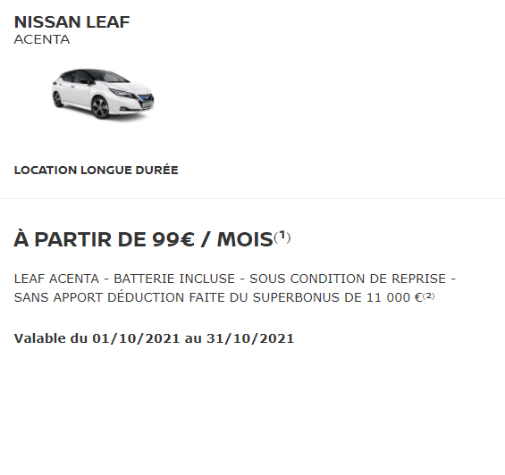 (1) Exemple pour une Nissan LEAF ACENTA 40kWh gamme 2021.5 neuve en Location Longue Durée sur 37 mois, 30 000 km maximum, avec 1er loyer de 11 000€, ramené à 0€ après imputation du superbonus gouvernemental de 11 000 €⁽²⁾, puis 36 loyers de 99€. Restitution du véhicule chez votre Concessionnaire en fin de contrat avec paiement des frais de remise en état standard et des kilomètres supplémentaires. Sous réserve d’acceptation par Diac – 14 ave du Pavé Neuf 93168 Noisy le Grand. Offre réservée aux particuliers, valable jusqu’au 31/10/2021 sur véhicules identifiés , livrés et immatriculés jusqu’au 31/12/2021 chez les Concessionnaires Nissan participants. Modèle présenté : Nissan LEAF Tekna 40kWh neuve avec options peinture métallisée bi-ton et technologie ProPILOT Park, avec 1er loyer de 11 000€, ramené à 0€ après imputation du superbonus gouvernemental de 11 000 €⁽²⁾, puis 36 loyers de 205€. (2) Bonus écologique de 6 000 € et prime à la conversion de 5 000 € (sous condition de revenus ; voir conditions sur primealaconversion.gouv.fr) Zéro Emission à l’utilisation, hors pièces d’usure. NISSAN WEST EUROPE: nissan.fr (3) Nouveau cycle d’homologation WLTP. LEAF jusqu’à 270 km en cycle mixte (jusqu’à 285 km sur VISIA) et 389 km en cycle urbain (jusqu’à 415 km sur VISIA). LEAF e+ jusqu’à 385 km en cycle mixte et 528 km en cycle urbain. Les valeurs de mesure obtenues par des essais en laboratoire conformément à la législation de l’UE (via le nouveau cycle d’essai harmonisé pour les véhicules légers WLTP) sont destinées à la comparaison entre les différents types de véhicules. Ces informations ne correspondent pas à un véhicule particulier ou à une offre commerciale. Les données peuvent ne pas refléter les résultats réels de la conduite. Les équipements optionnels, l’entretien, le comportement de conduite et des facteurs extérieurs, comme les conditions météorologiques, peuvent affecter les données. (4) Base prix moyen électricité tarif Bleu EDF, heures creuses consommation domestique compteur 6 kVA – septembre 2021. (5) Sauf LEAF Visia – câble domestique uniquement Zéro Emission à l’utilisation, hors pièces d’usure. NISSAN WEST EUROPE : nissan.fr