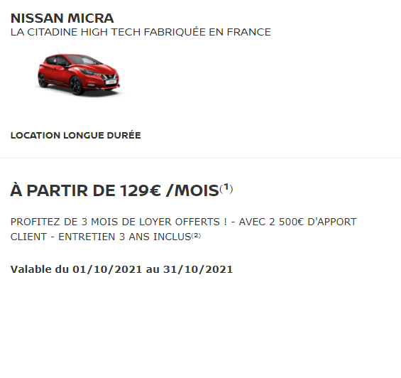 (1) Pour une Nissan MICRA gamme 2021, IG-T 92 VISIA PACK neuve en Location Longue Durée sur 49 mois, 40 000 km maximum, 3 loyers offerts après paiement du 1er loyer majoré (apport) de 2 500€, puis 45 loyers de 129€. Restitution du véhicule chez votre Concessionnaire en fin de contrat avec paiement des frais de remise en état standard et des kilomètres supplémentaires. Sous réserve d’acceptation par Diac – 14 ave du Pavé Neuf 93168 Noisy le Grand. (2) Comprenant les prestations d’entretien (hors pièces d’usure et pneumatiques) selon conditions contractuelles. Modèles présentés : Nissan MICRA gamme 2021, IG-T 92 N-SPORT neuve avec option peinture métallisée spéciale Rouge Volcano, 3 loyers offerts après paiement du 1er loyer majoré (apport) de 2 500€, puis 45 loyers de 203€. Offre réservée aux particuliers, non cumulable avec d’autres offres, valable jusqu’au 31/10/2021, chez les Concessionnaires NISSAN participants. NISSAN WEST EUROPE SAS : nissan.fr Consommations gamme cycle combiné (WLTP l/100km) : 5,3 – 6,3. Émissions CO2 (WLTP g/km) : 120 – 143.