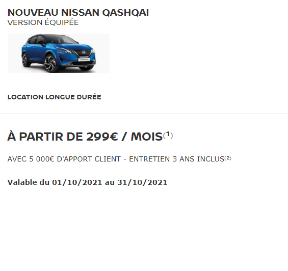 (1) Pour un Nouveau Nissan QASHQAI Mild Hybrid 140 ch N-STYLE neuf en Location Longue Durée sur 49 mois, 40 000 km maximum, 1er loyer de 5 000€ puis 48 loyers de 299€. Restitution du véhicule chez votre Concessionnaire en fin de contrat avec paiement des frais de remise en état standard et des kilomètres supplémentaires. Sous réserve d’acceptation par Diac – 14 ave du Pavé Neuf 93168 Noisy le Grand. (2) Comprenant les prestations d’entretien (hors pièces d’usure et pneumatiques) selon conditions contractuelles. Modèle présenté : Nouveau Nissan Qashqai Mild Hybrid 158ch Xtronic TEKNA+ neuf avec options peinture métallisée spéciale Bleu Magnétique + coloris bi-ton + jantes alliage 20 », 1er loyer de 5 000€ puis 48 loyers de 422€. Offre réservée aux particuliers, non cumulable avec d’autres offres, valable jusqu’au 31/10/2021, chez les Concessionnaires NISSAN participants. NISSAN WEST EUROPE SAS : nissan.fr. Consommations gamme cycle combiné (WLTP l/100km) : 6,3 – 7,1. Émissions CO2, (WLTP g/km): 142 – 159. *Apple CarPlay® est disponible en sans fil ou en filaire. Android Auto® est disponible en filaire uniquement.